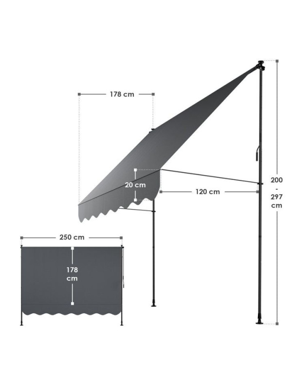 Balkónová markíza 250x120 cm, sivá, výškovo nastaviteľná