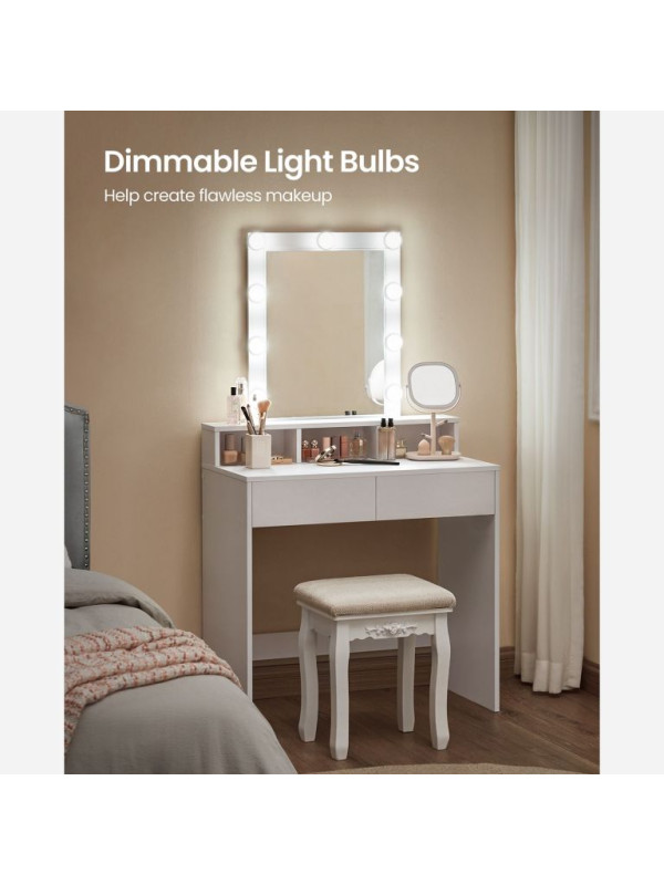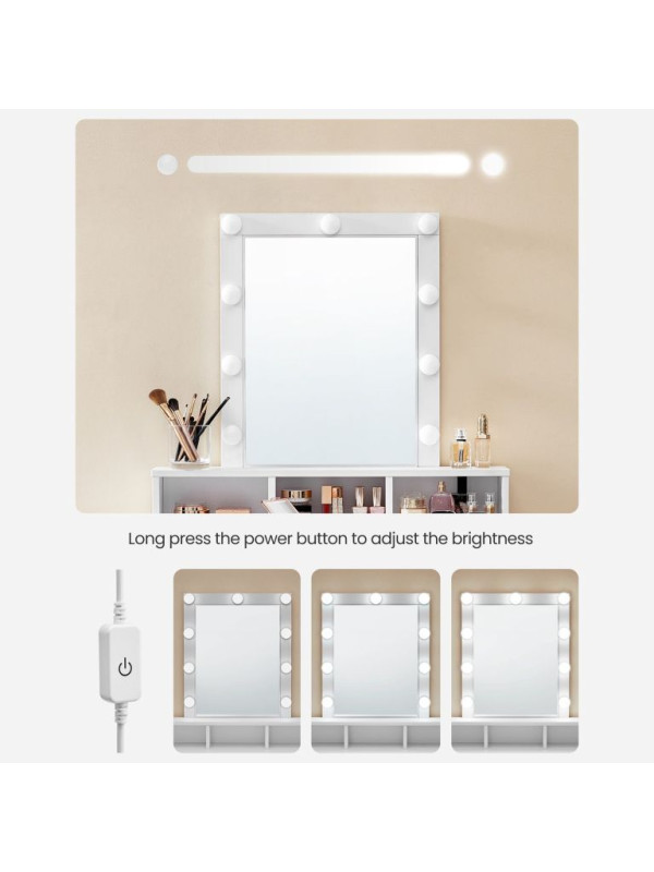 Objavte kúzlo každodennej starostlivosti s týmto toaletným stolíkom, ktorý premení vašu rutinu na radostný zážitok. Deväť stmievateľných LED žiaroviek poskytuje dokonalé osvetlenie pre precízne nanášanie make-upu. Čistý dizajn a svetlá farba rozžiaria váš domov a dodajú mu moderný nádych.