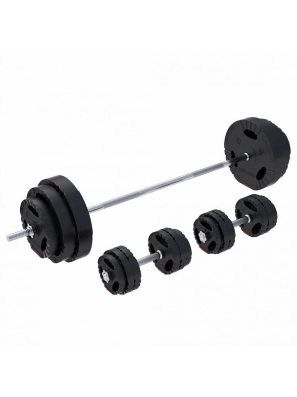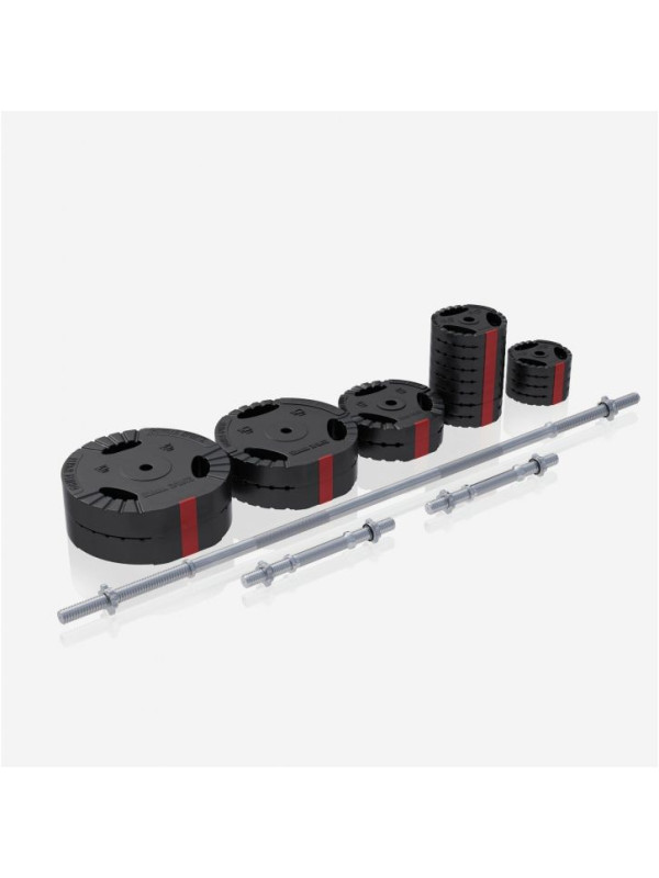 Technicky prepracované tyče s hviezdicovými zámkami umožňujú rýchlu výmenu kotúčov. Plastový plášť závaží chráni podlahu a žebrované úchopové plochy poskytujú stabilitu pri každom cviku. Sada je vhodná pre všetky kotúče s otvorom 30/31 mm a vďaka rozmanitosti závaží je ideálna pre začiatočníkov aj pokročilých.