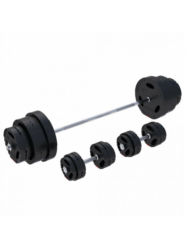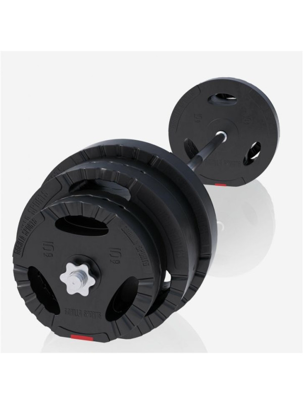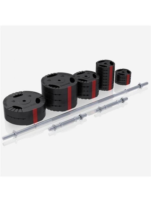 Chromovaná tyč s hviezdicovými zámkami umožňuje rýchlu výmenu závaží. Žebrovaný úchop zabezpečí pevné držanie. Plastový povrch závaží chráni podlahu pred poškodením. Sada je vhodná pre všetky kotúče s otvorom 30/31 mm. Jednoduchá údržba a vysoká odolnosť zaručujú dlhodobé používanie.