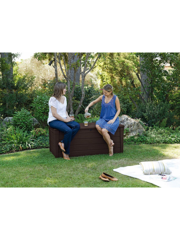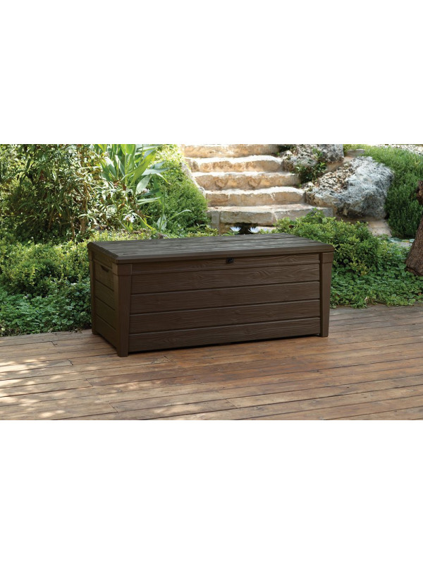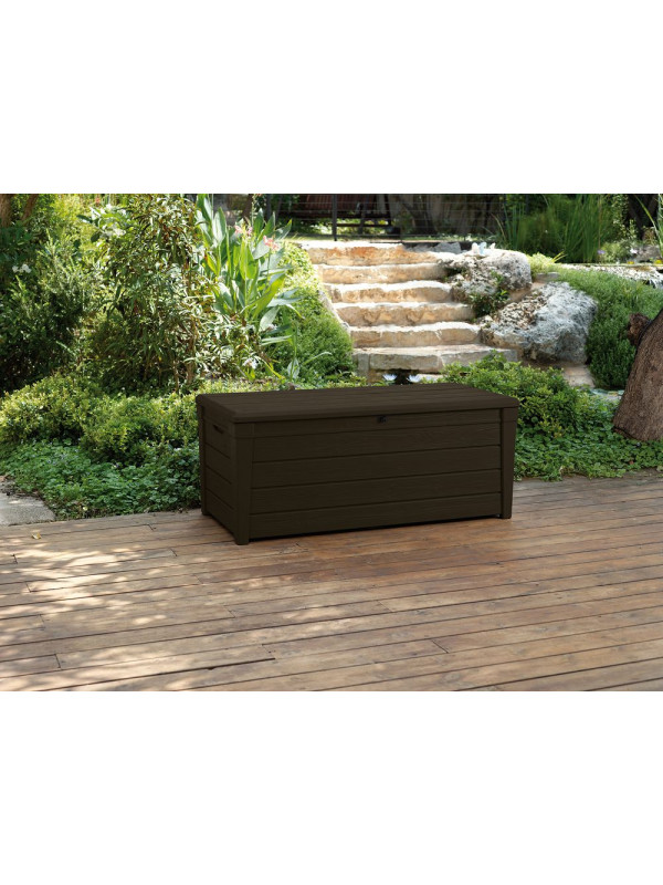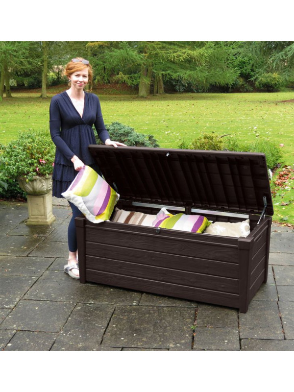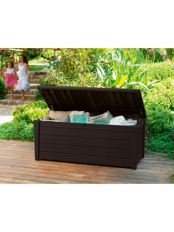 Väčší plastový box s úložným priestorom a objemom 455 l. Materiál: plast so vzorom imitácie dreva. Brightwood odkladací box umožňuje pohodlne uložiť všetko, čo chcete mať po ruke na Vašej záhrade. Vyznačuje sa veľkou kapacitou, vďaka tomu sa do neho zmestí napríklad záhradné náradie, vankúše alebo prikrývky. Jeho montáž je veľmi jednoduchá a nevyžaduje žiadne špecializované nástroje. Mechanizmus, ktorý uľahčuje otváranie veka, je nepochybne veľkou výhodou produktu.