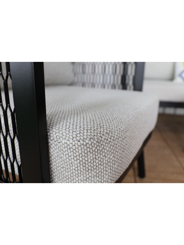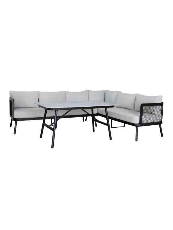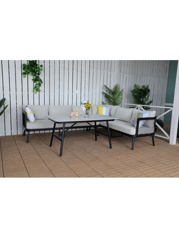 - materiál: čierna hliníková konštrukcia, doska stola z hliníka a pryskyřice, 12 cm vysoké podušky, tkanina (polyester 460 g/m2), vodu odpudzujúca tkanina