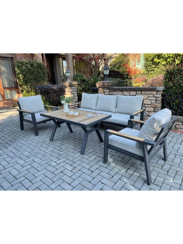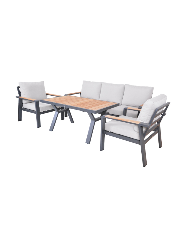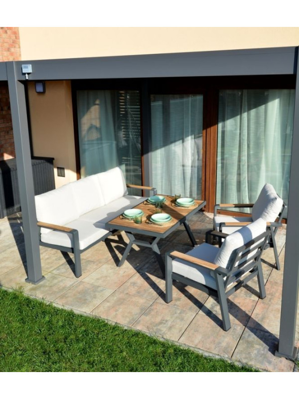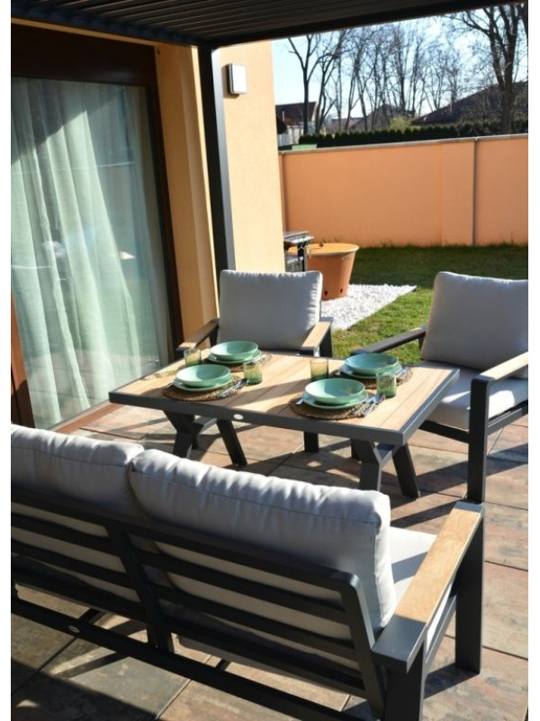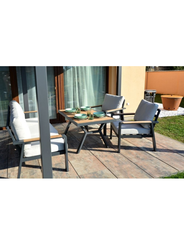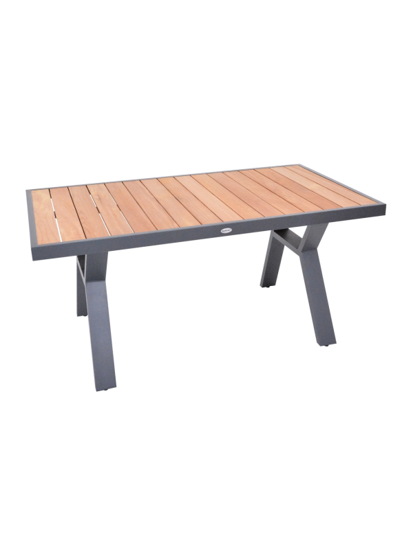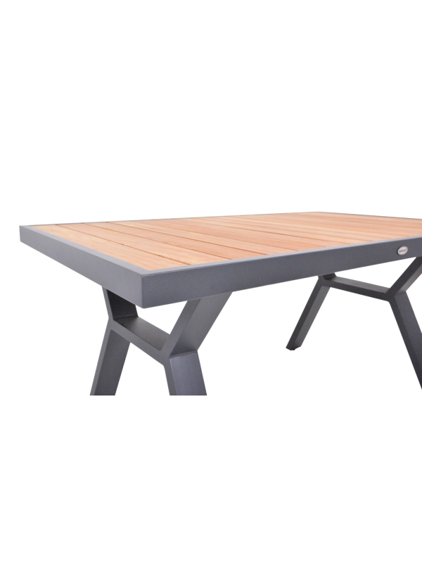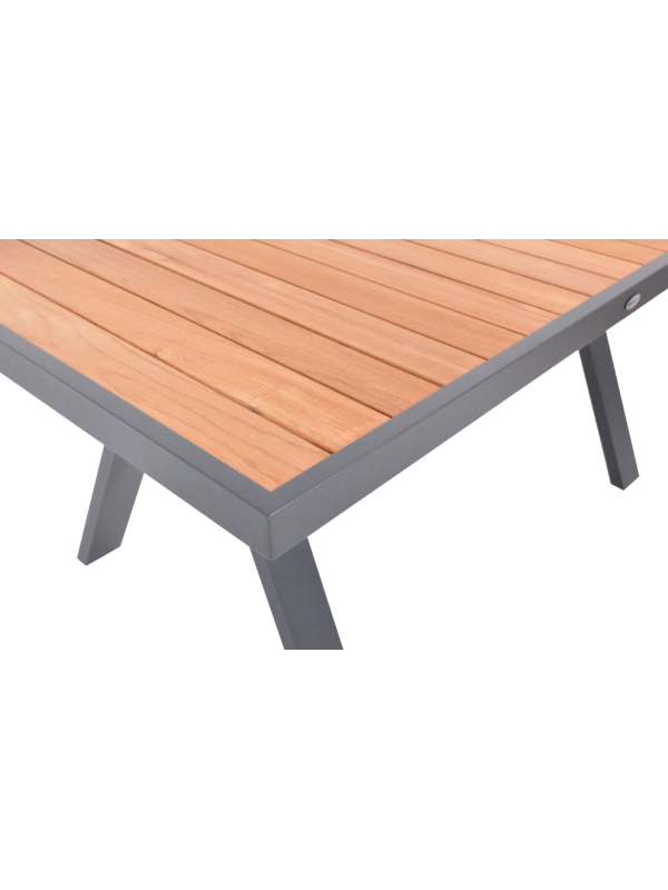 Vytvorte si príjemné miesto na stolovanie s týmto moderným jedálenským stolom z hliníka a teaku. Elegantný grafitový dizajn sa hodí do každého priestoru a vďaka kvalitným materiálom bude stôl slúžiť dlhé roky.
