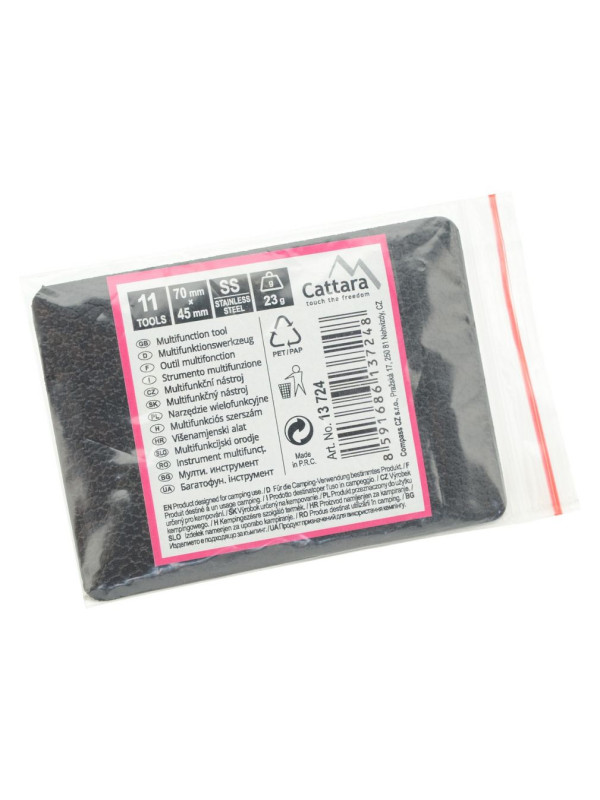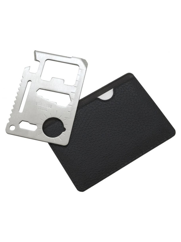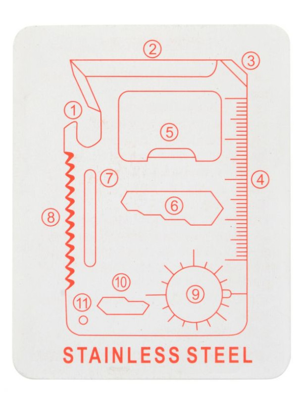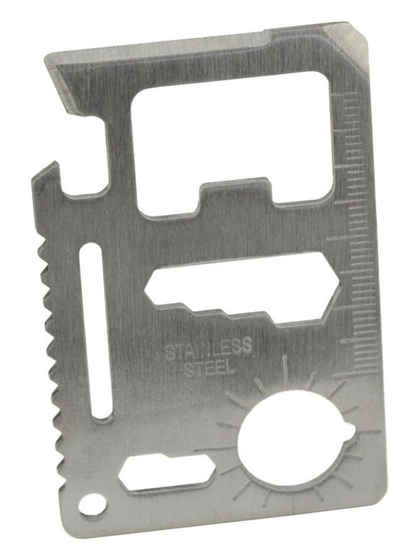 Multifunkčný outdoor nástroj na prežitie poskytujúci 11 funkcií, ktoré využijete v rôznych situáciách. Ide o drobný nástroj rozmerov 70 x 45 mm z kvalitnej nerezovej ocele o hrúbke 1,7 mm. Nástroj je vybavený otvárakom na plechovky a fľaše so zátkami, nožíkom, skrutkovačom, meradlom s milimetrovou stupnicou, pomocným smerovým ukazovateľom na mapu, kľúčom na matice a skrutky 4 najbežnejších rozmerov, kľúčom na krídlové matice, 2 polohovým kľúčom a v neposlednom rade pílkou.