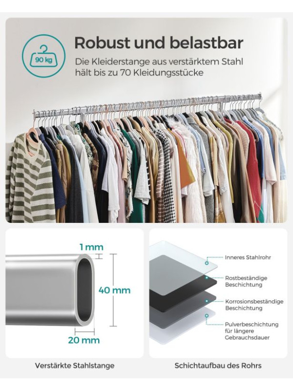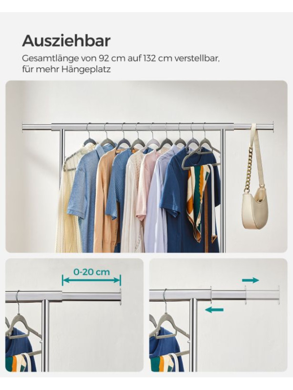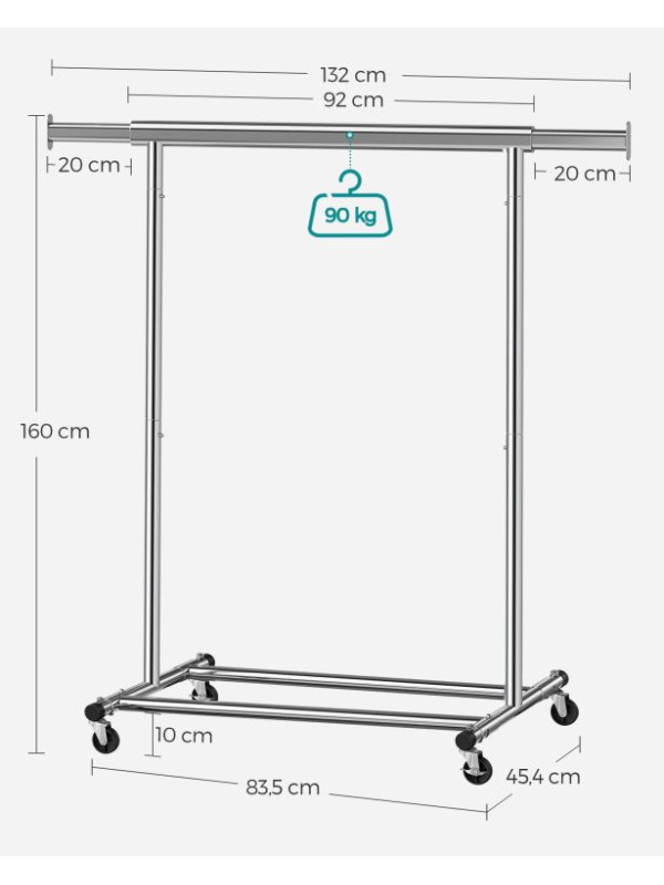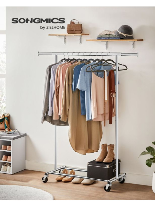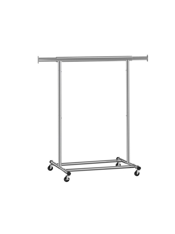 Vneste do svojho domova poriadok a prehľadnosť. Strieborný šatníkový stojan na kolieskach vám poskytne dostatok miesta na všetko oblečenie aj doplnky. Výsuvná horná tyč a bočné konce sú ideálne na kabelky, šály či klobúky. Perfektná voľba na každodenné použitie i sezónne uskladnenie.