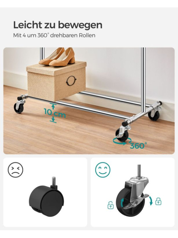 Silné oceľové rúrky s hrúbkou 1 mm a kvalitné kolieska zaisťujú stabilitu a jednoduchú manipuláciu. Montáž bez náradia zvládnete behom chvíľky a stojan je možné ľahko zložiť a uložiť, keď ho nepotrebujete. Vhodný aj na vonkajšie použitie vďaka chrómovanej oceli.