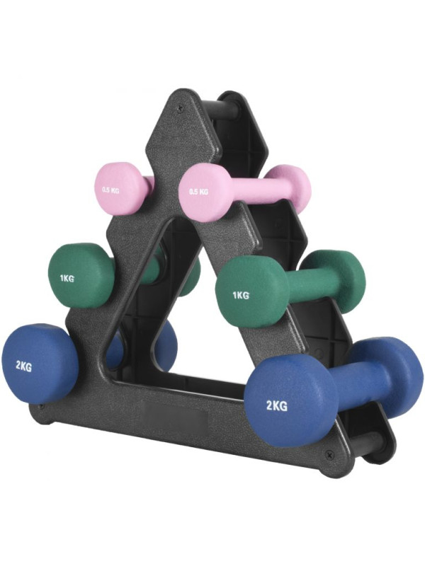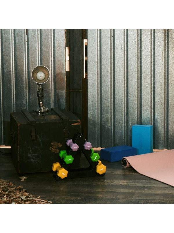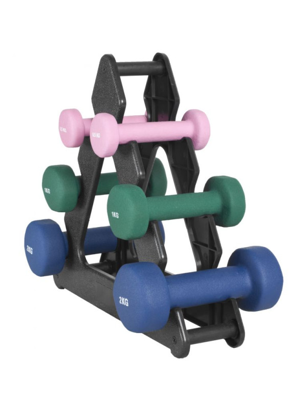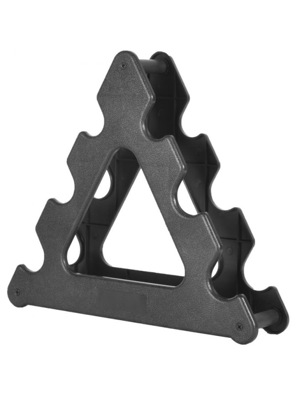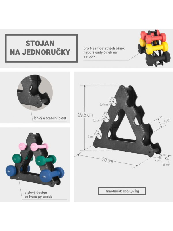 Ležia vaše činky v posilňovni len tak na podlahe alebo na krabici? Nemusí to tak byť. Použite praktický gymnastický stojan v čiernej farbe, aby ste mali svoje tréningové náčinie dobre roztriedené a prehľadne usporiadané. Na každý cvik nájdete tú správnu činku jedným ťahom. Po tréningu náčinie úhľadne odložíte na stojan. Športový dizajn v podobe pyramídy vyzerá vždy skvele a prinúti vás cvičiť nové cviky už len pri pohľade naň. Na stojan položíte až tri páry činiek. Je vyrobený z čierneho plastu, ktorý je ľahký a pevný. Dĺžka jeho okraja je 33 centimetrov na každej strane. Stojan je dodávaný bez činiek. Objednajte si samostatne tie správne závažia. Ak je to možné, vyberte iné farby. Uľahčia vám rýchly a presný prístup pri výmene činiek a pri upratovaní.
