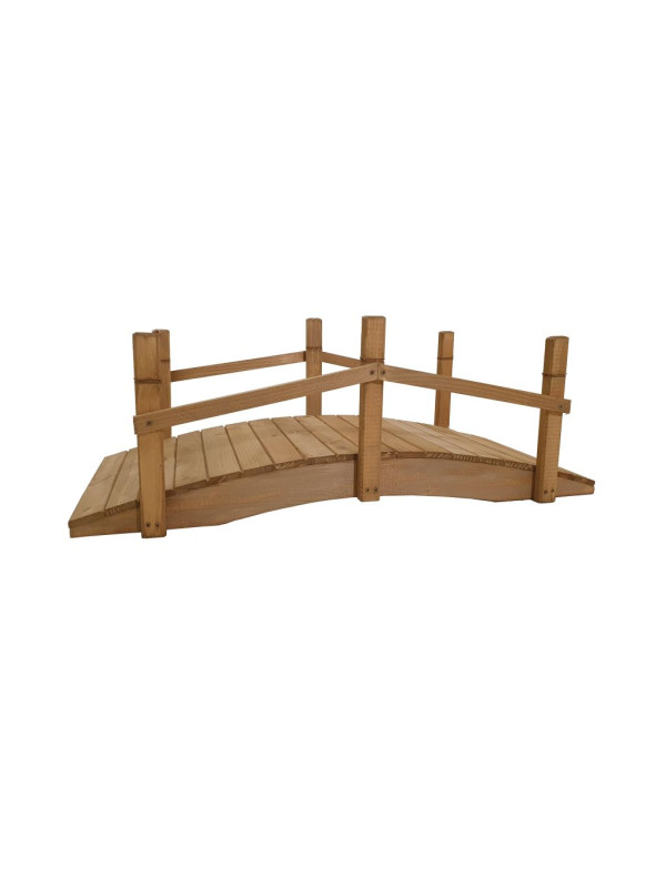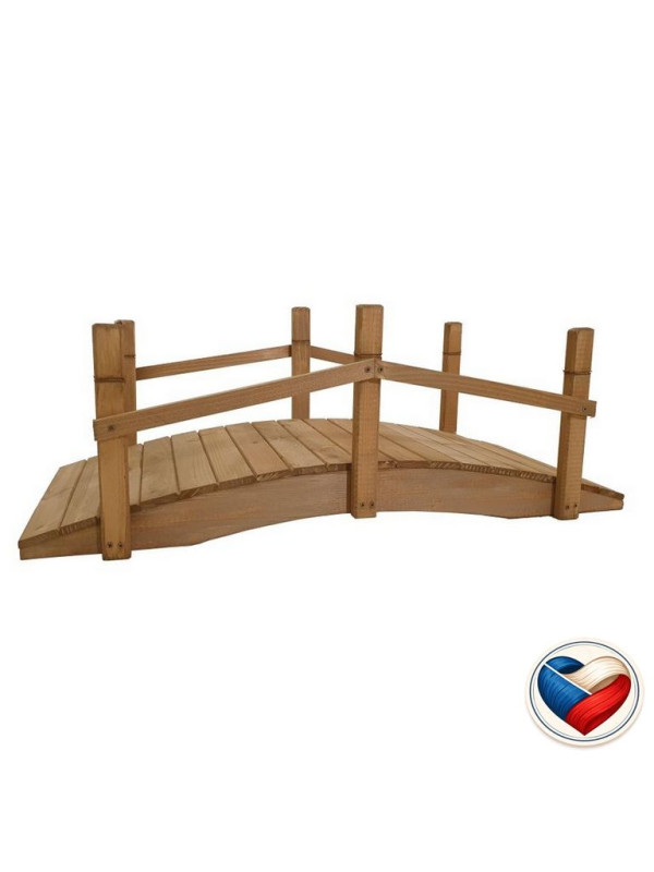 Drevený záhradný mostík s náterom. Drevený záhradný mostík zapadne do prírodného okolia vašej záhrady. Upustite uzdu svojej fantázie a vykúzlite si rozprávkovo krásnu záhradu s týmto originálnym doplnkom. Skvele by vyzeral napríklad na vami tak opečovávané skalce. Tento model je navyše kvalitne povrchovo ošetrený kvalitnou olejovou lazúrou, ktorá sa nelúpe a do budúcna sa dá pretrieť akýmkoľvek náterom určeným na drevo.
