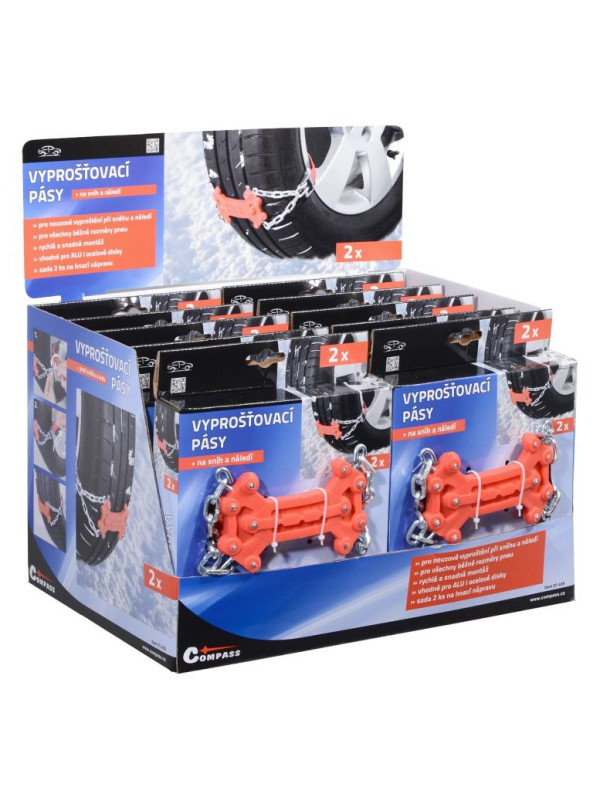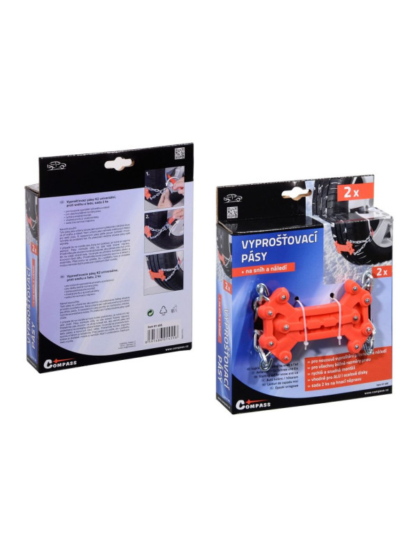 Univerzálne vyslobodzovacie pásy proti snehu a ľadu sú ideálne na núdzové vyslobodenie vozidla pri snehu, poľadovici alebo na blate. Sú vhodné pre všetky bežné rozmery pneumatík, a je možné ich použiť ako na oceľové, tak aj na ALU disky kolies.