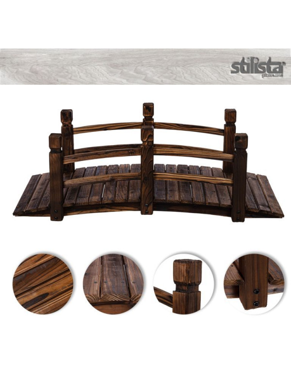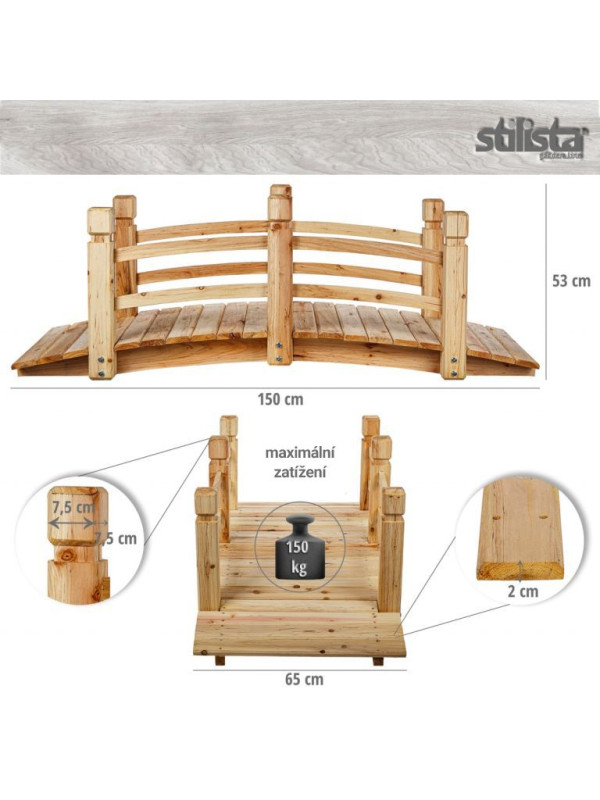 Drevený most je vďaka svojej pevnej konštrukcii mimoriadne stabilný a robustný a je možné ho zaťažiť až do hmotnosti približne 150 kg. Záhradný most je navyše orámovaný rustikálnym zábradlím. Vďaka predbežnému ošetreniu vhodným údržbovým olejom je most obzvlášť odolný voči poveternostným vplyvom a trvanlivý. Keďže sa jedná o prírodný produkt, šednutie a drobné praskliny sú normálnym procesom. Pravidelná starostlivosť môže predĺžiť životnosť mostíka.