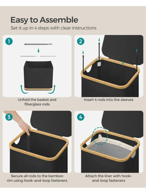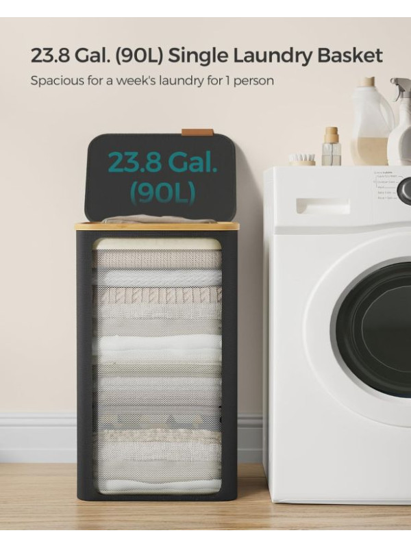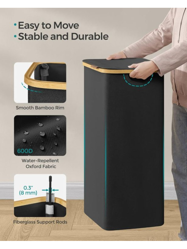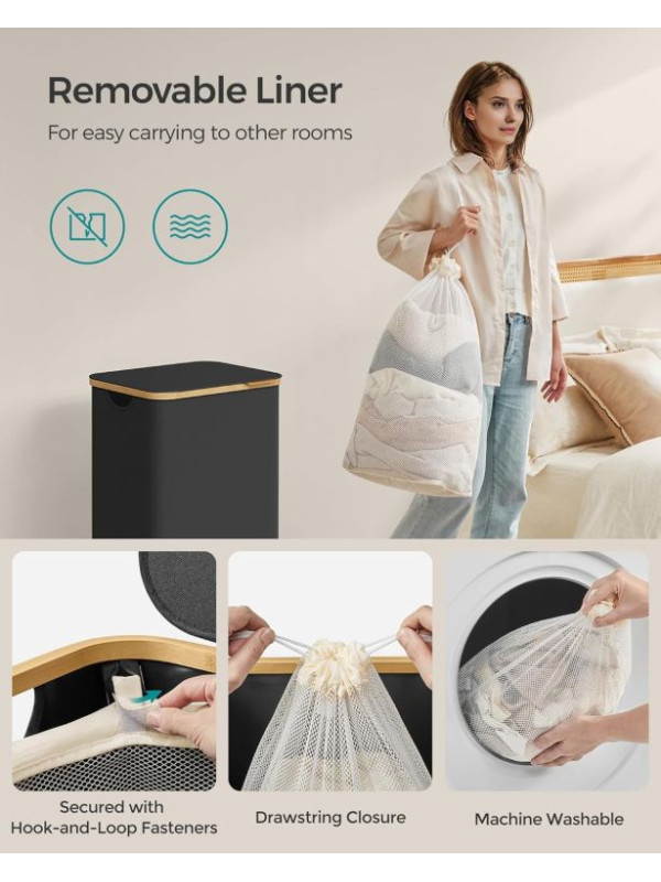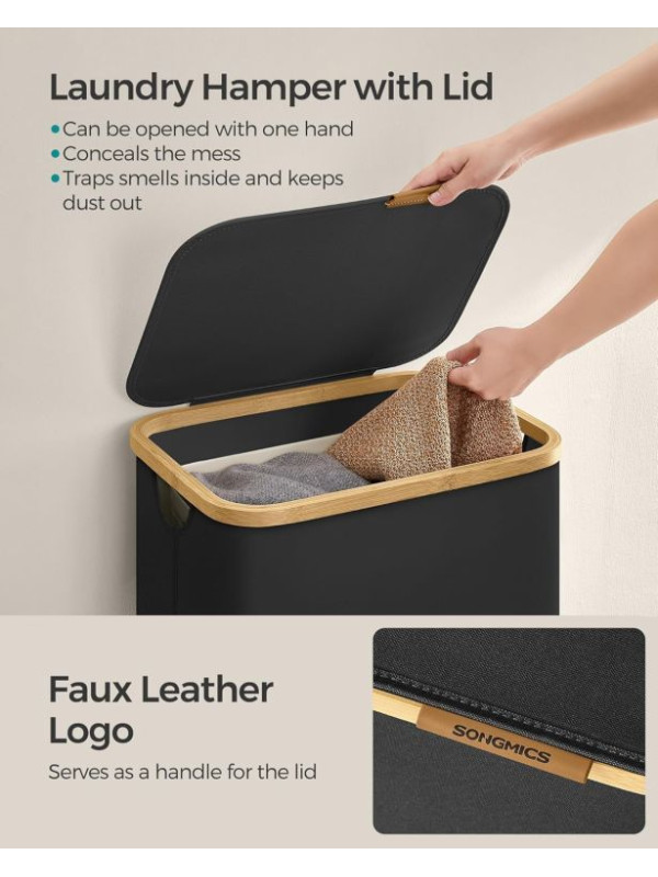 Urobte si poriadok v domácnosti s priestranným košom na bielizeň SONGMICS s objemom 90 litrov. Moderný dizajn v čiernej farbe, doplnený bambusovými úchytmi a praktickým vekom, skvele zapadne do každého interiéru. Vyberateľná sieťovaná vložka vám uľahčí manipuláciu aj pranie a vďaka skladacej konštrukcii kôš ľahko upratáte, keď ho práve nepotrebujete.