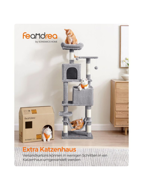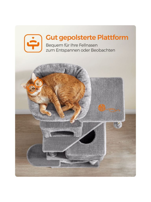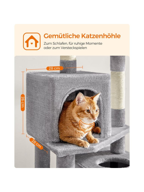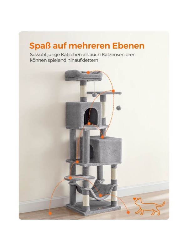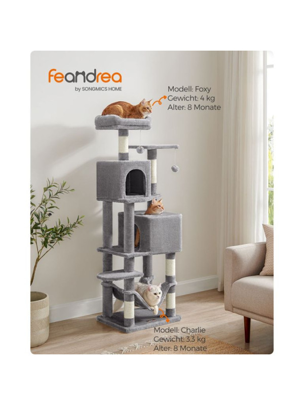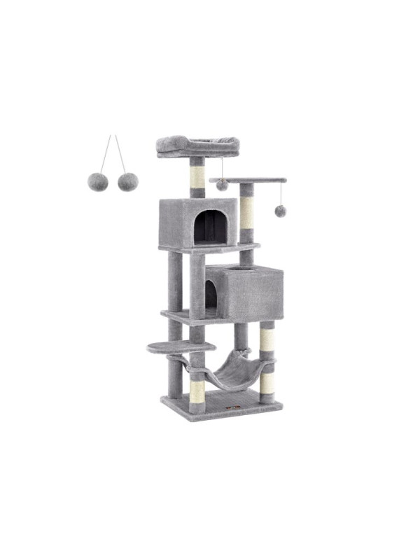 Doprajte svojej mačke luxusný priestor na hranie, škrabanie a oddych. Tento vysoký škrabací stĺpik v elegantnej svetlosivej farbe ponúka útulné postele, visiacu hojdačku a zábavné loptičky, ktoré potešia každú mačku a spríjemnia váš domov.