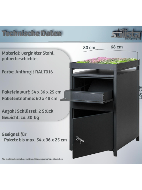Vnesiete do svojho domova štýl aj praktickosť s poštovou schránkou STILISTA, ktorá ponúka nielen bezpečné uloženie balíkov, ale aj priestor pre vašu kreativitu vďaka strieške na rastliny. Váš vstupný priestor získa originálny vzhľad a už nikdy sa nebudete musieť zaoberať stratenými zásielkami.