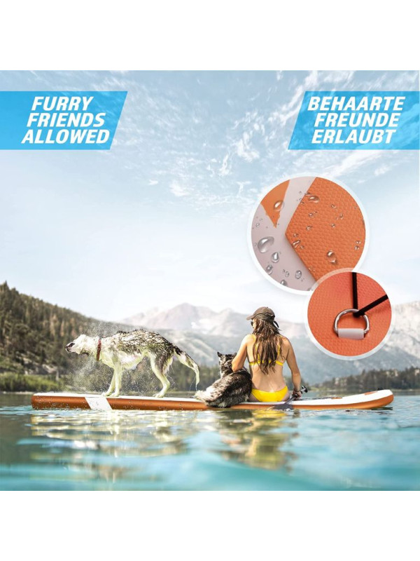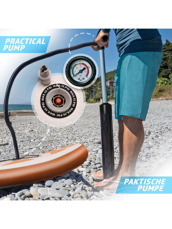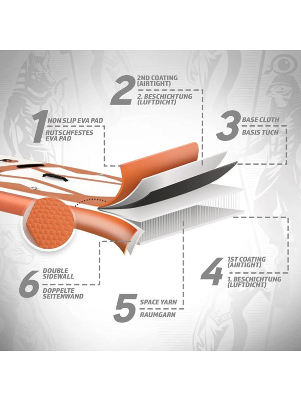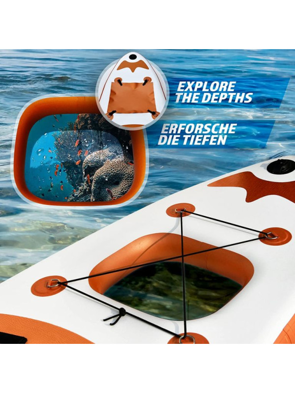 Paddleboard je vyrobený z materiálu PVC. Jeho hlavná doska je zosilnená technológiou Drop-Stitch. Drop-stitch je spojenie dvoch vrstiev tkaniny (PVC, Nitrilon) tisíckami a tisíckami vlákien z nylonu. Vďaka tomu nahusto umiestnené vlákna zaručujú, že materiál sa po nafúknutí nevyduje, ale drží tvar. Vďaka priehľadnému oknu môžete sledovať krásu podvodného sveta. Na doske tiež nájdete sedadlo, tri plutvy, praktickú rukoväť, protišmykovú a mäkkú EVA penu. Pre ľahké premiestňovanie máte k paddleboardu praktický batoh. Na rozdiel od mnohých iných modelov je tiež opatrený držiakom kamery na hornej strane dosky pre všetkých, ktorí chcú natáčať svoje dobrodružstvá. Dodáva sa s výsuvným dvojitým pádlom, bezpečnostným lanom na členok, ručnou pumpičkou, batohom, vodeodolnou taškou a súpravou na opravu.