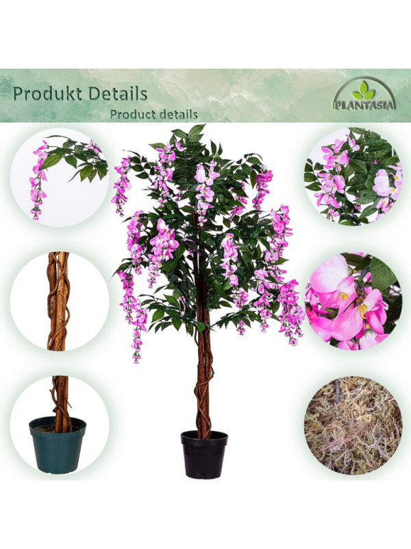 Umelý strom má autenticky zakorenený kmeň s približne 756 listami a 24 kvetnými cípmi. Vďaka detailne prepracovaným listom a kvetom vyzerá umelý stromček mimoriadne realisticky a od skutočného ho možno len ťažko rozoznať. Skutočný drevený kmeň z palmového dreva dotvára realistický vzhľad vistérie. Náš umelý stromček sa dodáva v čiernom kvetináči s Ø 18 x v 17 cm, ktorý je možné ľahko umiestniť do ozdobného kvetináča podľa Vášho výberu. Umelé rastliny nepotrebujú svetlo ani vodu a je možné ich použiť aj v miestnostiach, kam nemožno umiestniť skutočné rastliny.