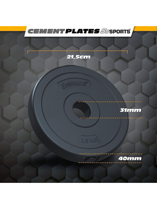 - Hmotnosť diskov: 8 x 2,5 kg, 4 x 1,25 kg, 4 x 1 kg