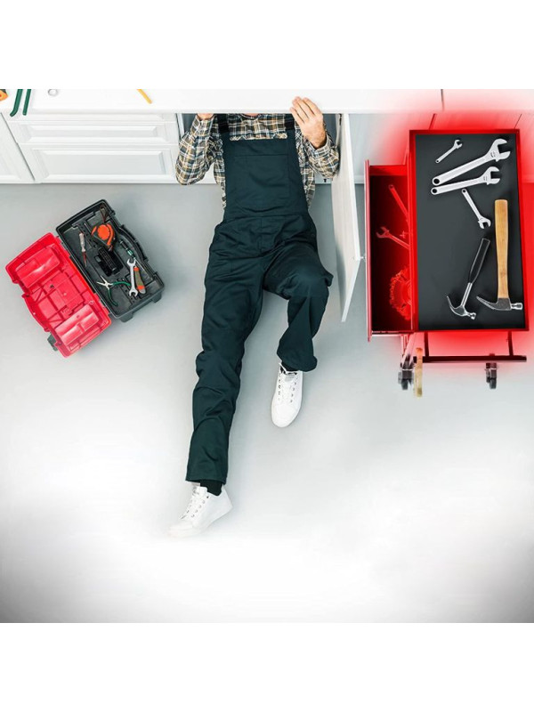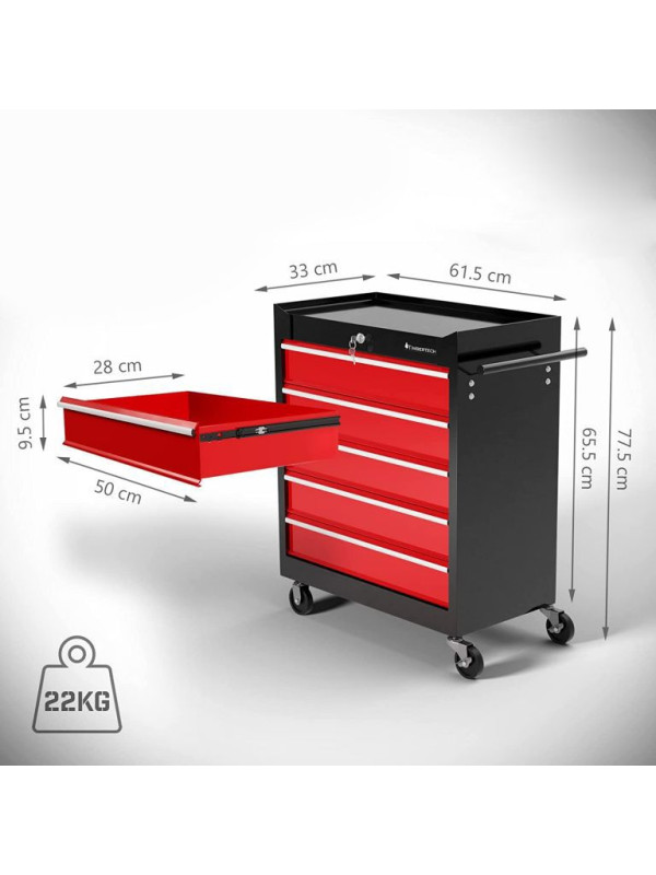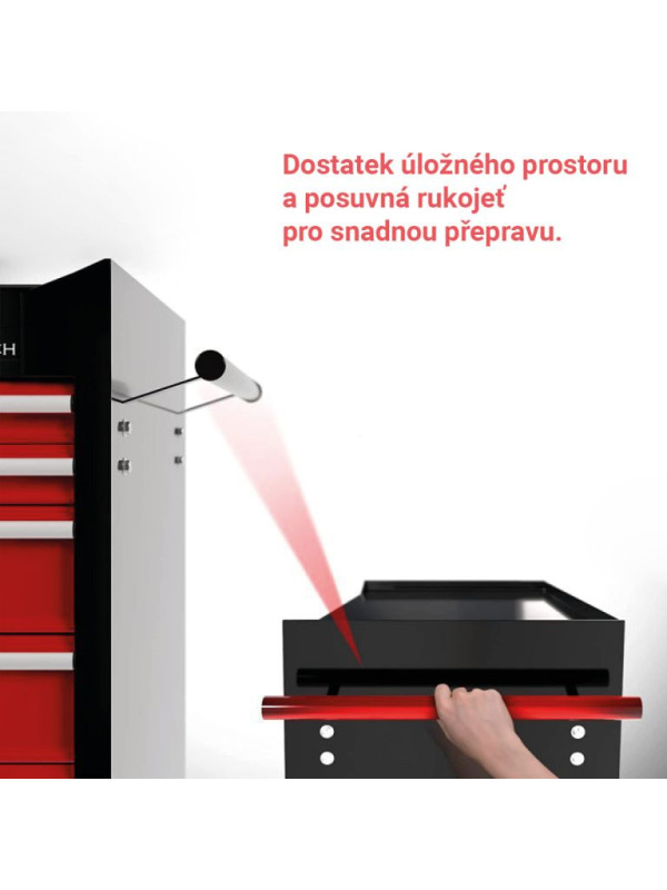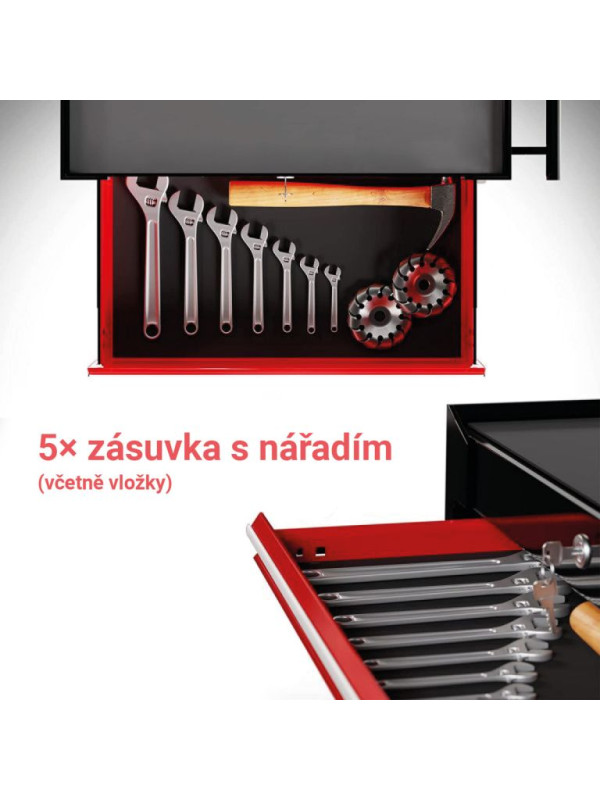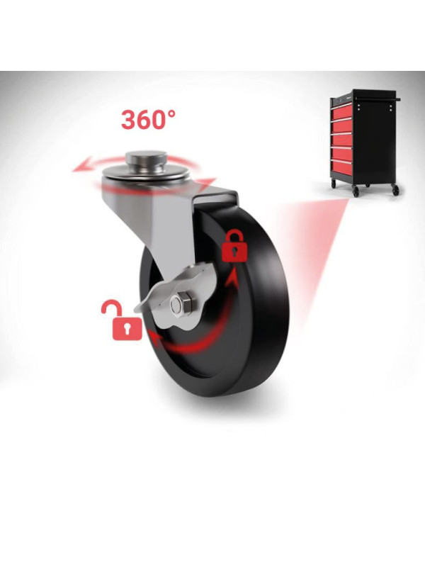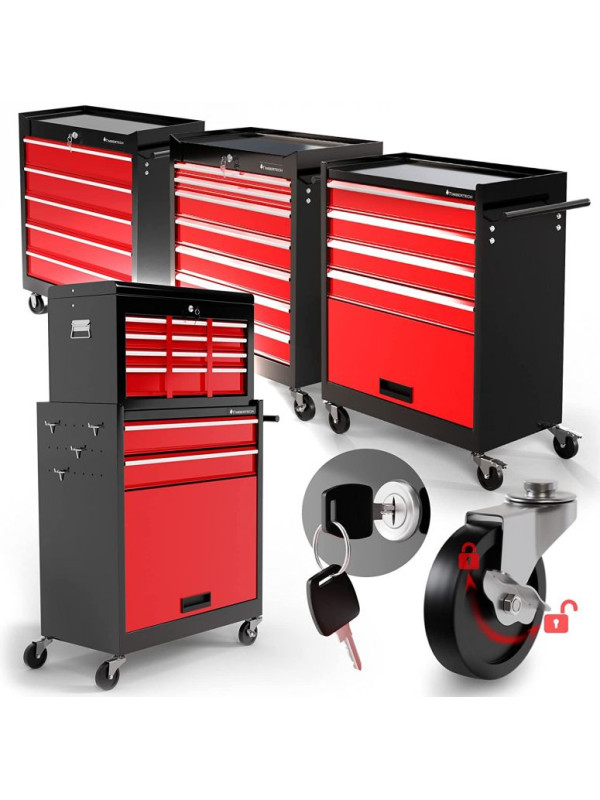 Vozík na náradie bol navrhnutý pre Vaše náradie, ktoré potrebujete mať vždy po ruke, a pomôže Vám udržať poriadok v garáži. Mobilný dielenský vozík je vybavený úložným priestorom a piatimi zásuvkami (s vložkami), ktoré ponúkajú dostatok úložného priestoru pre dôležité dielenské príslušenstvo. Tento montážny vozík má 4 riadiace kolesá, z ktorých 2 majú parkovacie brzdy, takže vozík môžete v garáži voľne premiestňovať, ale aj ho zafixovať na jednom mieste. Integrovaný centrálny zámok uzamkne všetky zásuvky naraz, takže ich počas prepravy nie je možné otvoriť a všetky Vaše veci sú bezpečne uložené v skrini na náradie.
