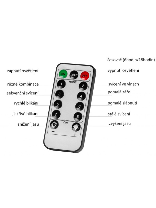 Súčasťou osvetlenia je aj diaľkové ovládanie, vďaka ktorému osvetlenie na diaľku nielen zapnete a vypnete. Môžete zároveň nastaviť časovač (osvetlenie bude potom vždy 6 hodín svietiť a 18 hodín "spať") alebo využiť možnosť zvýšenia a zníženia jasu. Samozrejmosťou je tiež 8 svetelných funkcií: rôzne kombinácie, svietenie vo vlnách, sekvenčné svietenie, pomalá žiara, rýchle blikanie, pomalé slabnutie, iskrivé blikanie, stále svietenie.