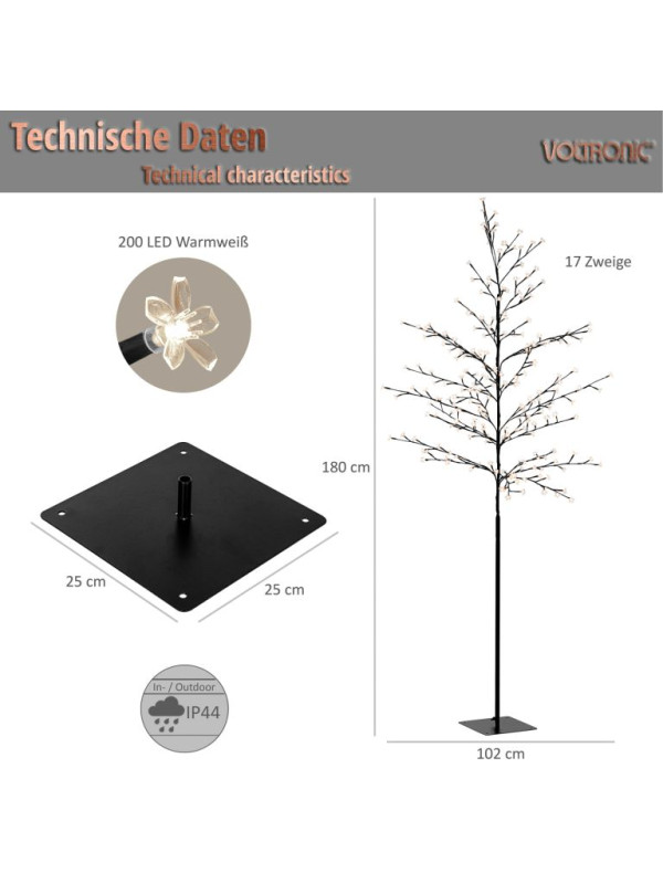 Kvetovaný strom navyše ponúka osem rôznych svetelných režimov a premení tak každé miesto v naozajstný svetelný sen. Strom je dodávaný s robustnou kovovou základňou, ktorá je navyše vybavená štyrmi otvormi pre upevnenie do zeme. Vďaka vodotesnosti IP44 je svetelný strom vhodný pre vnútorné i vonkajšie použitie.